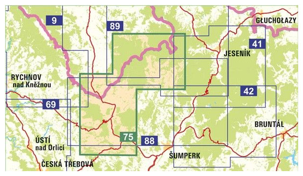 Auf der Rückseite der Wanderkarte ist der südwestliche Anschluss des tschechisch-polnische Grenzgebietes mit dem Ort Dolni Morava am Oberlauf der Morava abgebildet sowie die Städte Králíky, Červená Voda und Štíty. In Polen ist die Stadt Międzylesie im Nordteil sichtbar.